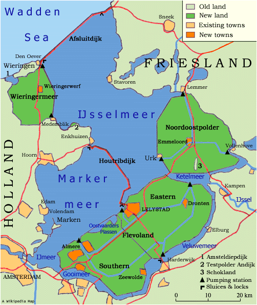 Map of the new Province of Flevoland reclaimed from the seabed. The project started with closing the Zuider Zee in the 1930s as a flood protection strategy.