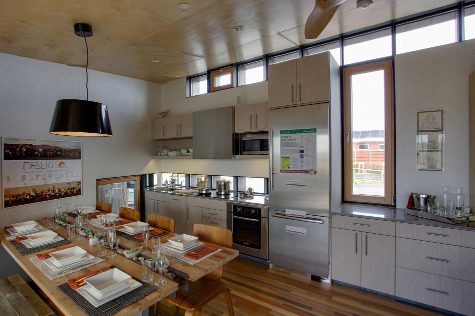Kitchen interior University of Nevada Photo by Jason Flakes Published October 15, 2013 at 950 × 633 in U.S. Solar Decathlon: The Winner Is… ← Previous Next → Spectacular kitchen design with soaring ceiling in the Las Vegas house — and solar-powered to boot. Spectacular kitchen design with soaring ceiling in the Las Vegas house — and solar-powered to boot.