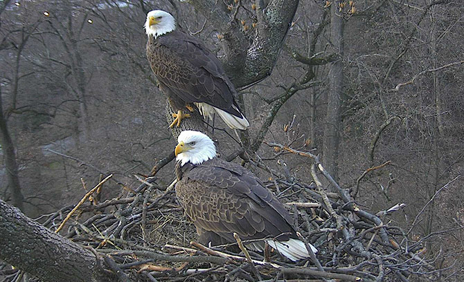 Bald Eagle Chicks in Washington DC: A pair of bald eagle chicks that hatched several days apart in full view of a live web cam at the US National Arboretum has attracted thousands of onlookers. The chicks are now being fed by their parents with fish from the Anacostia River. The parents are nicknamed Mr. President and First Lady; no names yet for the chicks, which are being called DC2 and DC3. The family is perched atop a nest in a tall tulip poplar tree that was used in 2014 by a mated pair to hatch and care for a single chick. The live webcam is operating 24/7. It takes 12-13 weeks, according to Al Cecere founder of the American Eagle Foundation, for the chicks to grow their feather and be ready to fledge. Check out #dceaglecam. See the Washington Post story.