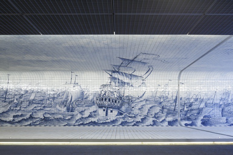 Bicycling through Amsterdam? Or just walking, you can see an exceptional display of ceramic tiles in the Cuyperspassage at Amsterdam’s Central Station. Some 80,000 Delft tiles are installed along the walls and floor – a project by Benthem Crouwel Architects. The tunnel at 110 meters in length connects the city with the Ij River – a passage used by 15,000 commuters every day.