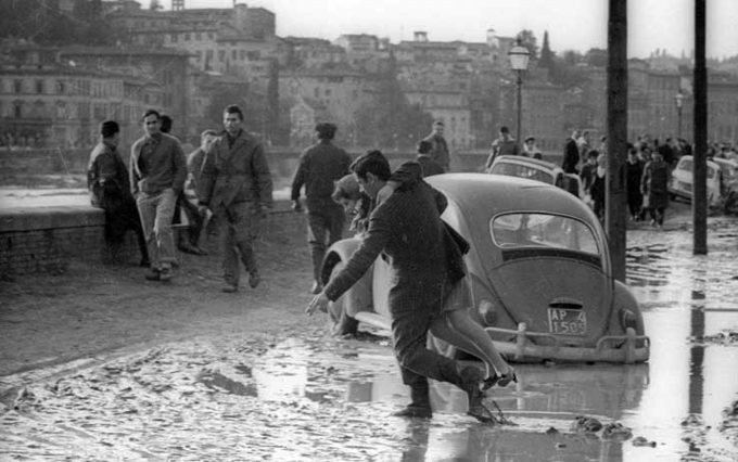 It’s been 50 years since the Arno River’s banks overflowed, bringing a raging torrent of water, mud, abandoned vehicles, and dead animals rushing through the narrow streets of Florence’s historic center—flowing at up to 45 miles per hour– inundating some of the city’s most valued Renaissance landmarks and priceless contents that included manuscripts, books, parchments and works of art. A marker near Florence’s train station notes the flood’s high point at about 10 feet above street level.
