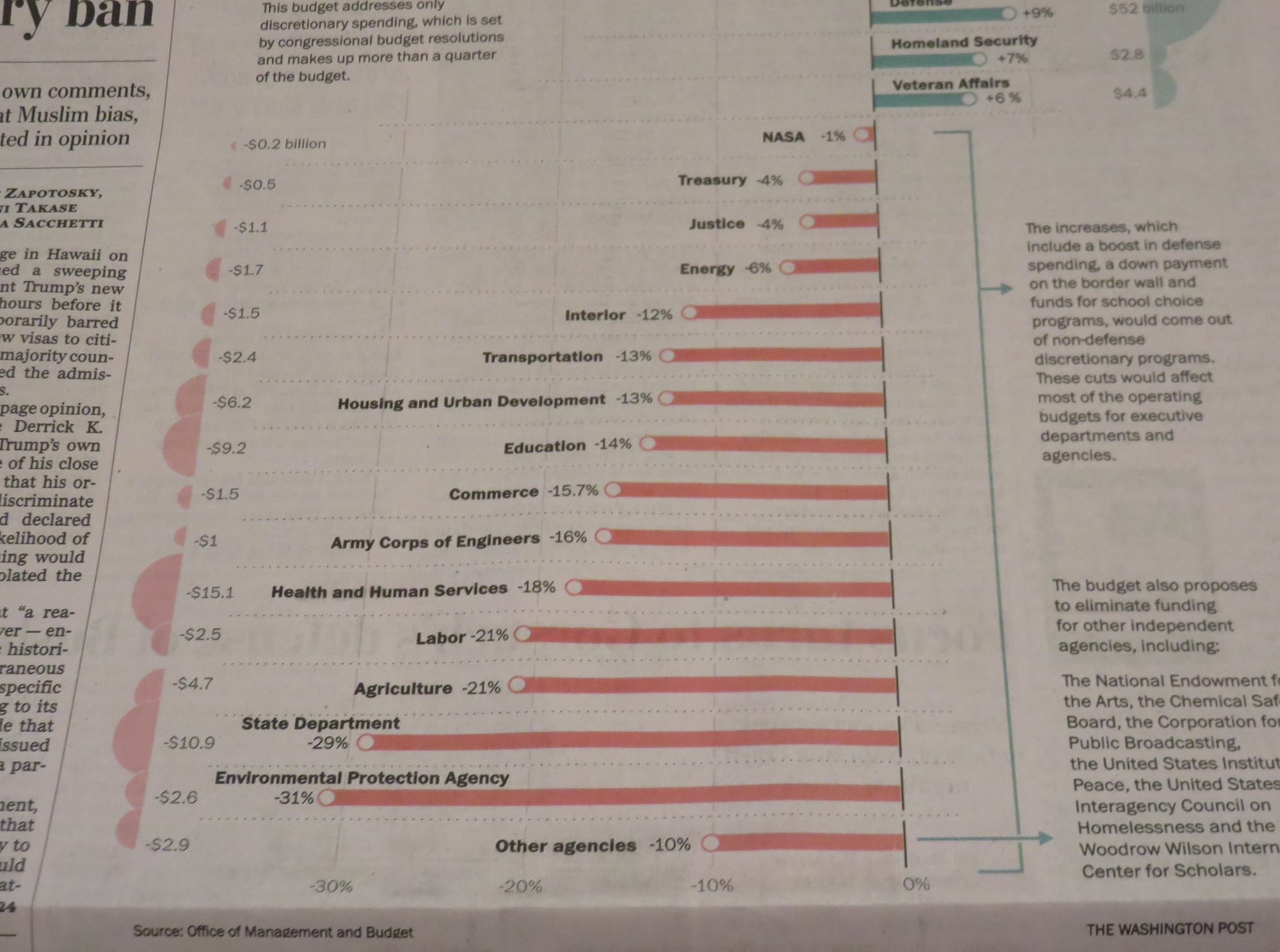Targeting the arts, humanities, museums, public broadcasting to defund them completely. Courtesy of the Washington Post (March 16 2017)